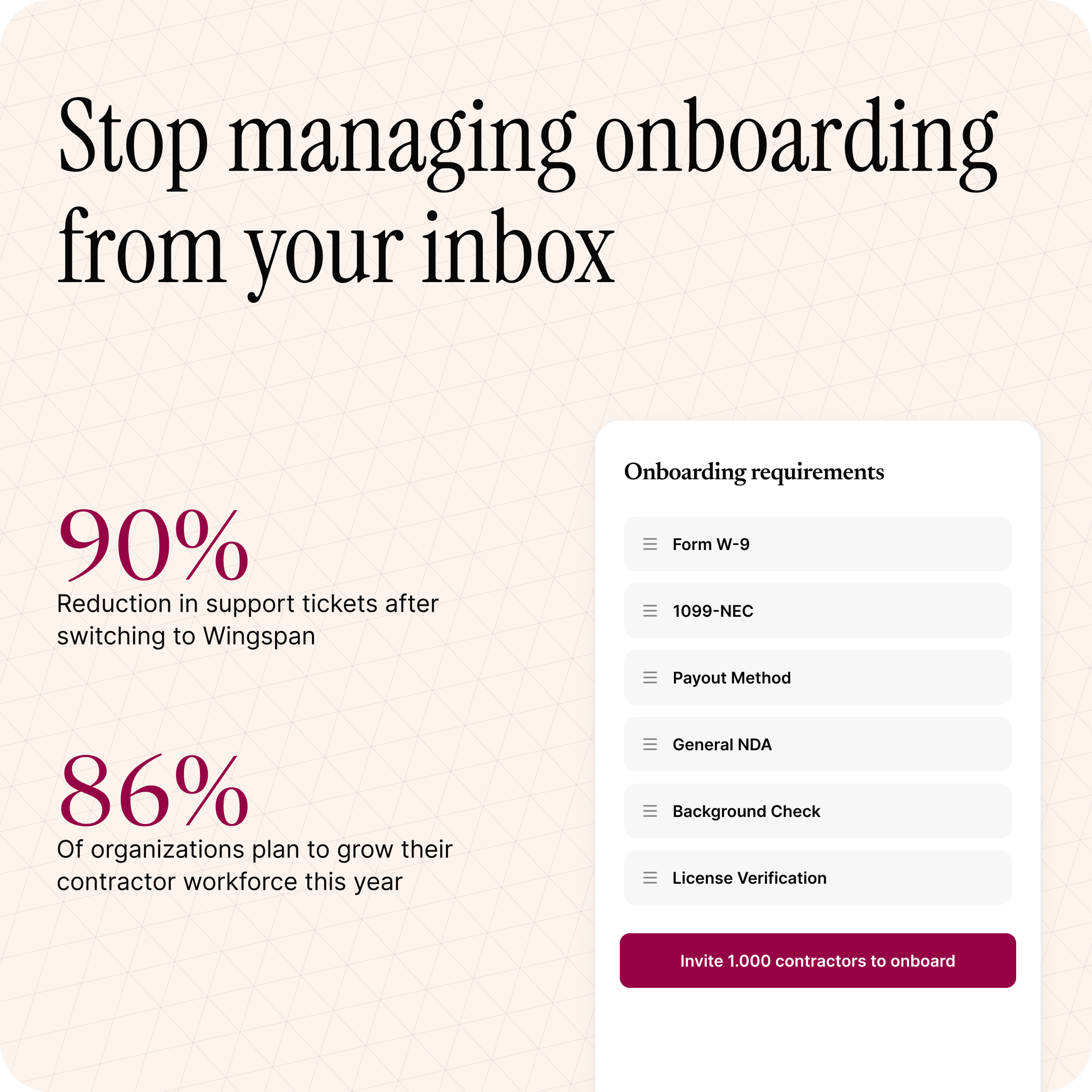 Wingspan replaces the inbox chaos with structured onboarding — automated W-9 collection, TIN verification, and credential checks — giving your team real-time visibility into every contractor's status. One telehealth company cut support tickets by 90% after switching. With 86% of organizations planning to grow their contractor workforce this year, the right infrastructure isn't optional.