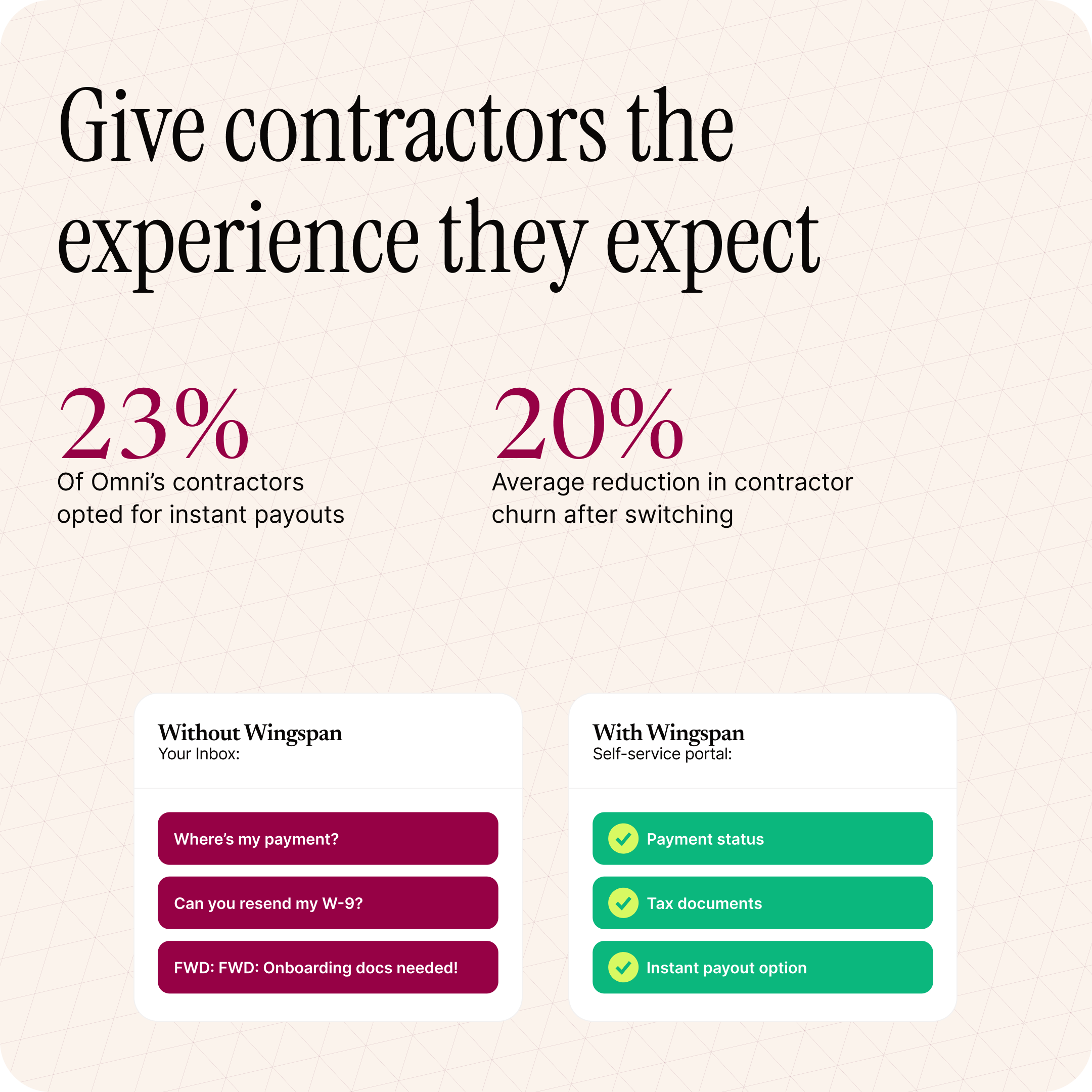 Contractors notice when the experience is held together with email attachments and manual follow-ups. Wingspan's self-service portal gives them payment status, tax documents, and profile management — so they stop flooding your inbox. Companies that switch see a 20% average reduction in churn, and 23% of contractors on Omni's network opted for instant payouts.